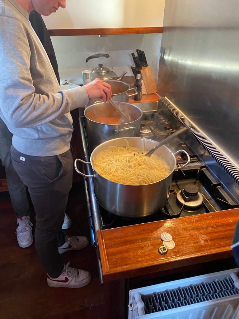 Voor ons eerste avondmaal deden wij spaghetti. Ik had zelf thuis al de saus klaargemaakt omdat dit al veel werk scheelde voor ons. Iemand anders zorgde dan ook voor het vlees omdat het halal moest zijn. Dan was het nog immers gewoon de pasta, vlees en saus opwarmen en serveren.
