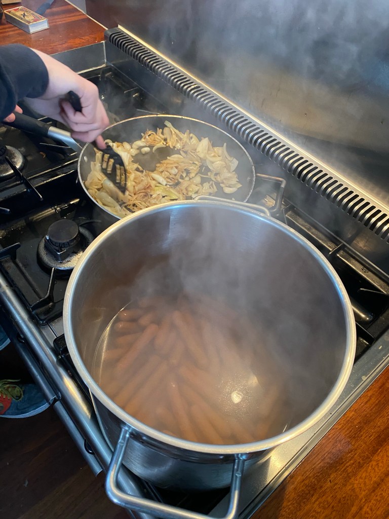 Toen ik klaar was met zwemmen was het middag en dacht ik ik ga al beginnen met de tafel te dekken en te koken. Toen ik alles klaar zette was derrest van de groep daar ook ondertussen. De tafel was gedekt ajuinen had ik al gesneden en worsten in een pot gedaan. Ik vond dat de rest zulder moesten dus.