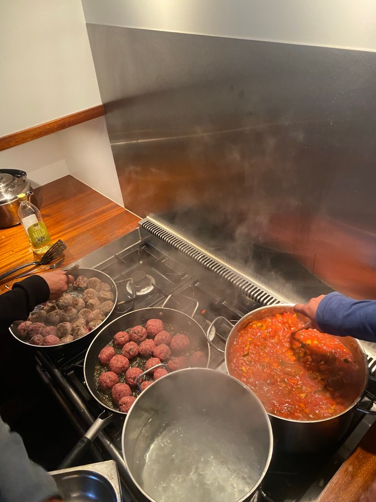 Dan hebben we ballen gedraaid zodat we deze konden voorbakken plus de saus die we konden voorwarmen.