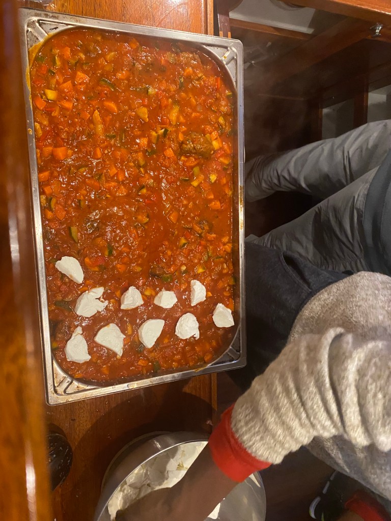 Als laatste deden we de afwerking van het gerecht zodat deze de oven in kon en bakken maar.